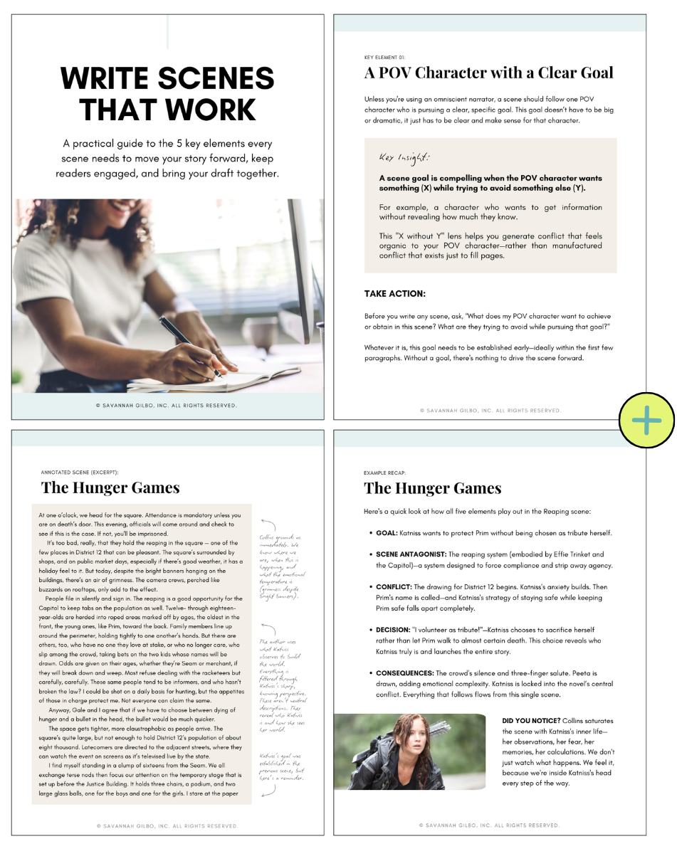 Learn the five elements every scene needs to move your story forward and keep readers engaged. This guide breaks down each element with clear explanations, actionable steps, and an annotated excerpt from The Hunger Games so you can see exactly how a bestselling author puts it all into practice.